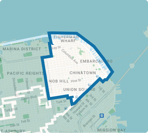 District 3 includes North Beach, Chinatown, Telegraph Hill, North Waterfront, Financial District, Nob Hill, Union Square, Maiden Lane, and part of Russian Hill.